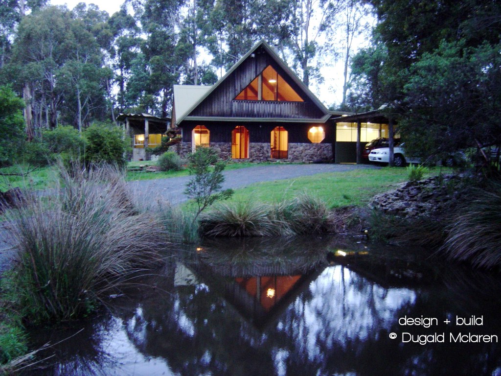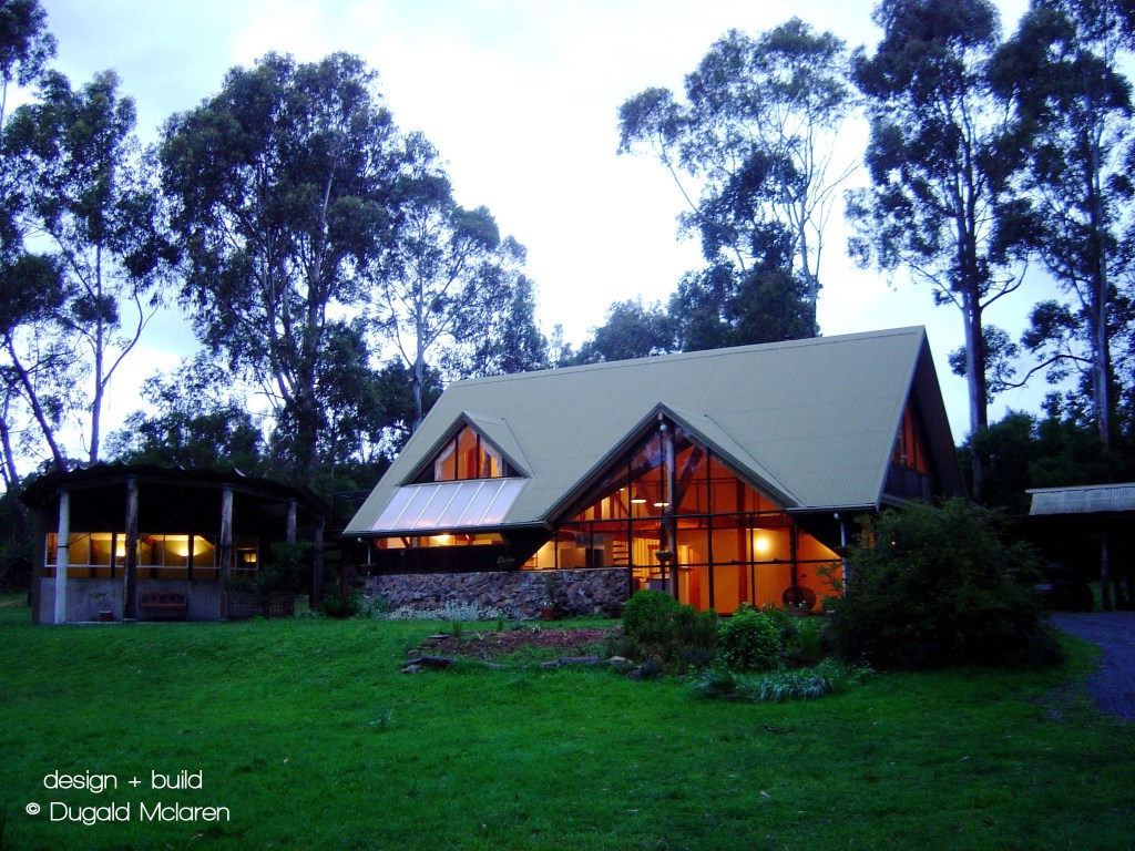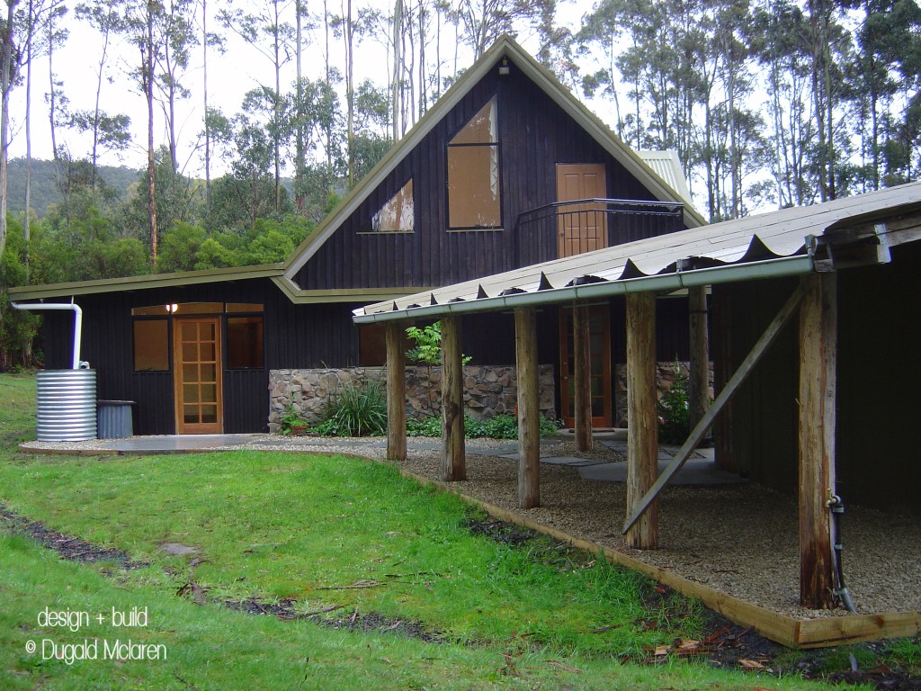 A passive solar house and studio featuring Tasmanian myrtle beams, and local stone and local blue gum poles. Steel beam plates and fero-cement and copper bathroom